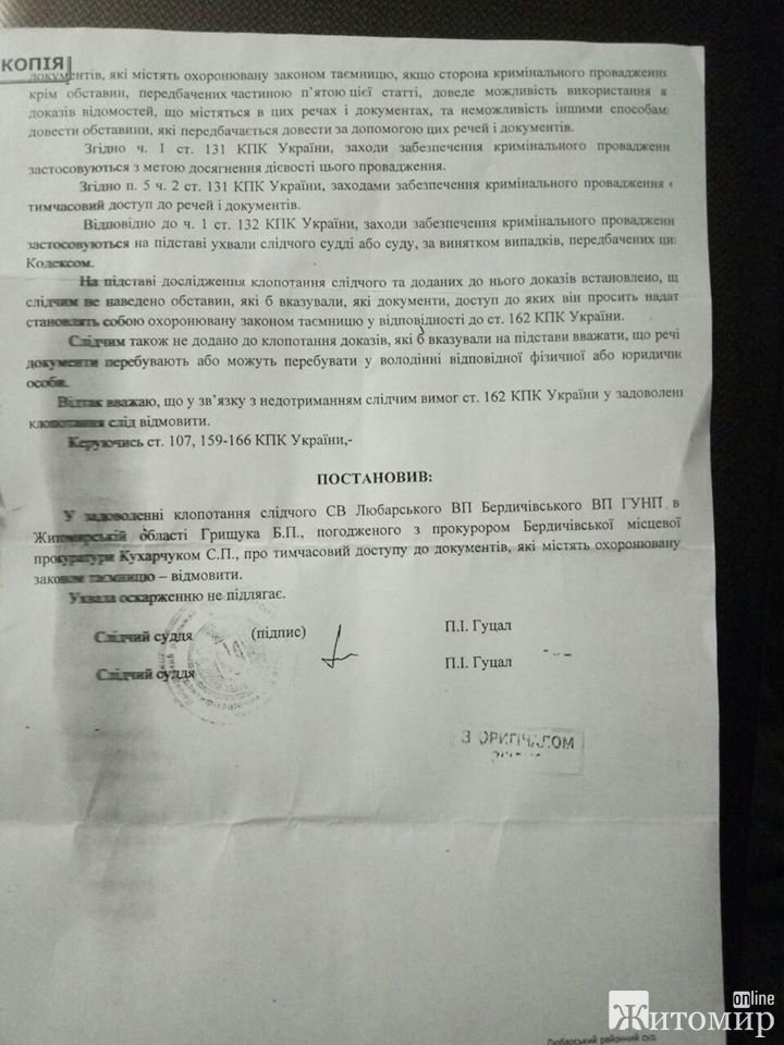 * Слідчий суддя Гуцал Павло Іванович ВІДМОВИВ в клопотанні слідчого Грищука (це взагалі нонсенс) про тимчасовий доступ до документів, які містять охоронювану законом таємницю (відеозаписи з камер кафе “Любар”). Дане рішення в скорому часі буде оскаржене у Апеляційному суді Житомирської області, та подана скарга на суддю Гуцала П.І. до Вищої ради правосуддя. Тут висновок в тому, що слідчого тримають ні за кого!