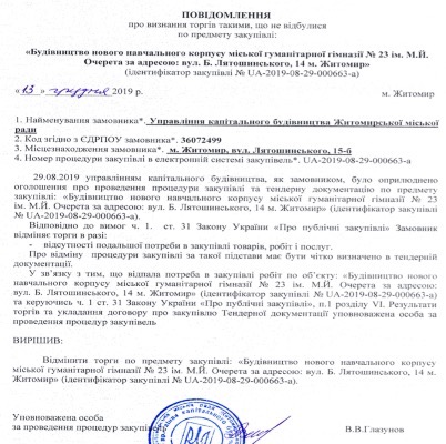 Адже тендер на будівництво нового навчального корпусу міської гуманітарної гімназії № 23 ім. М.Й. Очерета було оголошено ще в серпні 2019 року. І не просто оголошено тендер на пошук підрядника. Був замовлений і виконаний проект цього будівництва вартістю всього-на-всього 1 497 265,20 грн! А тепер найцікавіше, в першу чергу для батьків дітей, які будуть навчатися де завгодно, тільки не в своїй школі – вже проведений тендер був відмінений. Причина – ВІДСУТНІСТЬ ПОДАЛЬШОЇ ПОТРЕБИ! Так просто: була потреба у новому корпусі, і тут – хоп, і її не стало! «Ловкость рук и никакого мошенничества»!