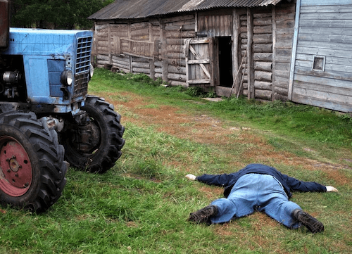 В кабине этого трактора никого не было, а тело тракториста обнаружили рядом – он каким-то образом выпал из кабины трактора и оказался под его колесами. Трактор с прицепом несколько раз проехался по нему, не оставив ни малейших шансов на выживание.