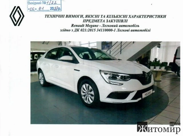 Виконавчий комітет Житомирської міської ради має намір укласти угоду з ТОВ «Полісся Моторс Груп» на закупівлю легкового автомобіля Renault Megane вартістю 588 тис. грн.