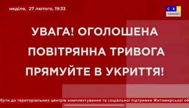 ‼Громадо‼У разі сигналу тривоги телеканал СК1 перериває трансляцію та вмикає ось таке оголошення, яке начитується диктором. Сигнал відбою теж транслюється!