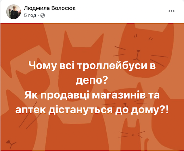 Реклама ПІДПИСАТИСЯ НА TELEGRAMПІДПИСАТИСЯ НА FACEBOOKСвіжі новиниЗаклад BROT у Житомирі потрапив у скандал ще до...Покалічений війною і загублений у системі: історія ветерана з...На трасі Київ-Чоп поліція затримала 36-річного чоловіка, який під...Розслідування на Звягельщині: поліція та прокуратура перевіряють причини масової...FacebookTwitterTelegramWhatsAppViberEmailPrintCopy URL ГоловнаПодіїЖитомиряни скаржаться на те, що не працює міський транспортЖитомиряни скаржаться на те, що не працює міський транспорт27 Лютого, 2022р 20:57Житомиряни не задоволені, що міські тролейбуси не працюють: Реклама Скаргу мотивують тим, що продавці магазинів та аптекарі не можуть дістатися до своїх домівок. Реклама Поширити у Facebook Попередня статтяСартану обстріляно. ЗновуНаступна статтяЖитомирян оповіщатиме про сигнал тривоги також телеканал СК1Читайте також ІнформаціяЗаклад BROT у Житомирі потрапив у скандал ще до відкриття 21 Квітня, 2026р 21:07 ІнформаціяПокалічений війною і загублений у системі: історія ветерана з Житомирщини 21 Квітня, 2026р 20:49 ІнформаціяНа трасі Київ-Чоп поліція затримала 36-річного чоловіка, який під виглядом військового вимагав пальне на АЗС 21 Квітня, 2026р 19:24 ІнформаціяРозслідування на Звягельщині: поліція та прокуратура перевіряють причини масової загибелі тварин на ДП «Рихальське» 21 Квітня, 2026р 18:52 ІнформаціяВстановити пандуси, підйомники та пішохідну інфраструктуру – у Житомирі облаштовують безбар’єрні маршрути 21 Квітня, 2026р 17:50 ПодіїНа війні Малинська громада втратила Захисника Володимира Андрієнка 21 Квітня, 2026р 17:41 Реклама