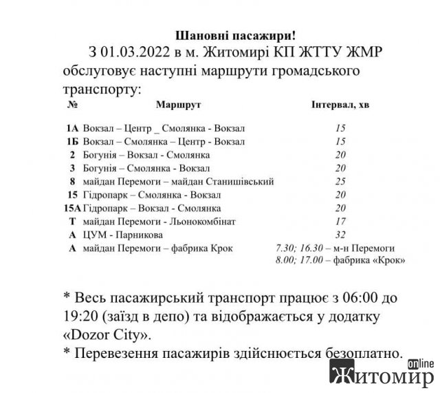 Реклама ПІДПИСАТИСЯ НА TELEGRAMПІДПИСАТИСЯ НА FACEBOOKСвіжі новиниУ Житомирі на вулиці Князів Острозьких третій день питна...Житомирське «Полісся» у меншості обіграло «Оболонь» та повернулося на...На Житомирщині вдова загиблого військового звинувачує владу Волицької громади...У центрі Житомира обвалюється фасад історичної будівлі ХІХ століття....FacebookTwitterTelegramWhatsAppViberEmailPrintCopy URL ГоловнаУкраїнаДіючий графік руху громадського транспорту в ЖитомиріДіючий графік руху громадського транспорту в Житомирі13 Березня, 2022р 12:40 Реклама Поширити у Facebook Попередня статтяВ Італії перекинувся автобус з українцями: 1 загиблий, кілька постраждалихНаступна статтяЧерез постійні повітряні тривоги немовлят Житомирської дитячої лікарні евакуювали до ЧернівцівЧитайте також ІнформаціяУ Житомирі на вулиці Князів Острозьких третій день питна вода зливається в каналізацію 26 Квітня, 2026р 20:11 ПодіїЖитомирське «Полісся» у меншості обіграло «Оболонь» та повернулося на третє місце в УПЛ 26 Квітня, 2026р 20:02 ПодіїНа Житомирщині вдова загиблого військового звинувачує владу Волицької громади у байдужості 26 Квітня, 2026р 18:40 ПодіїУ центрі Житомира обвалюється фасад історичної будівлі ХІХ століття. ФОТО 26 Квітня, 2026р 15:51 ПодіїНегода у Житомирі: у мікрорайоні Польова величезне дерево розчавило три припарковані автомобілі. ВІДЕО 26 Квітня, 2026р 14:58 ПодіїДеревопад у Житомирі триває: на вулиці Київській ще одна береза перегородила дорогу. ФОТО 26 Квітня, 2026р 14:27 Реклама