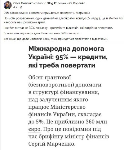 Если считать по цифрам и убыткам опубликованных Кабмином один день войны для Украины в прямых потерях стоит 66 млрд $ в день. Это разрушение инфраструктуры, заводов, фабрик, дорог, многоэтажных домов и т.д.