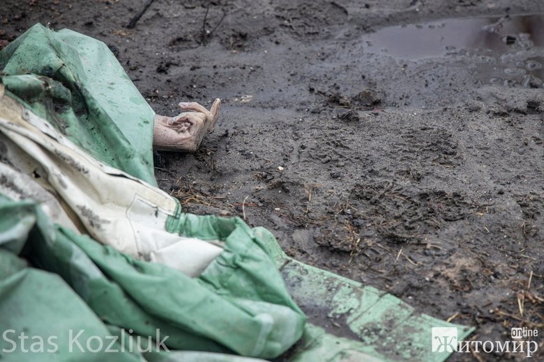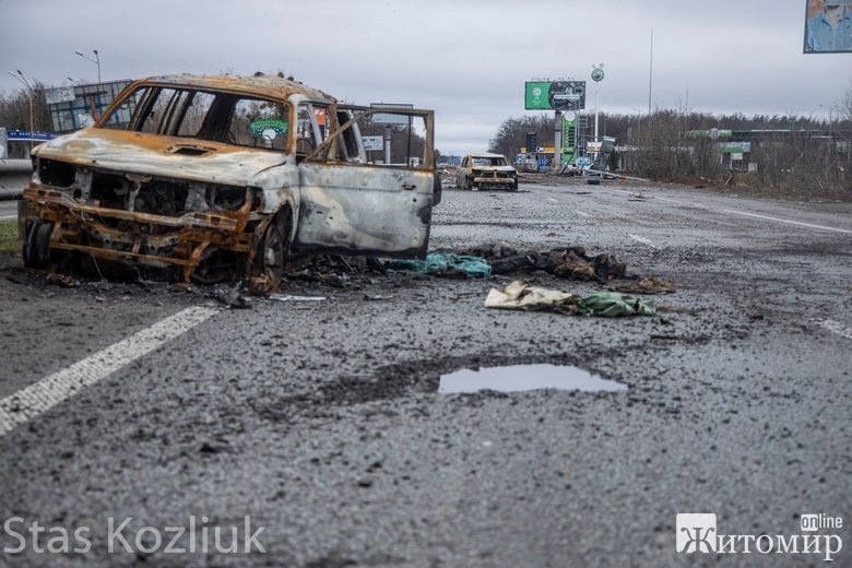За 20-25 кілометрів від столиці в бік Житомира на трасі лежать тіла вбитих окупантами українців. Частину з цих людей розстріляли, а потім намагалися спалити.