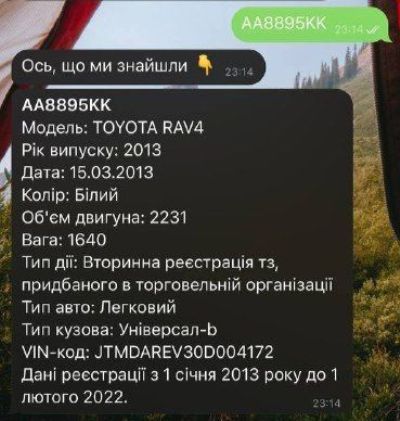У відкритій базі журналісти знайшли інформацію про автівку з цими номерами. Попередньо відомо марку машини — Toyota RAV4 білого кольору, яку зареєстрували у 2013 році. Відомо також, що власник прописаний у Дарницькому районі Києва.