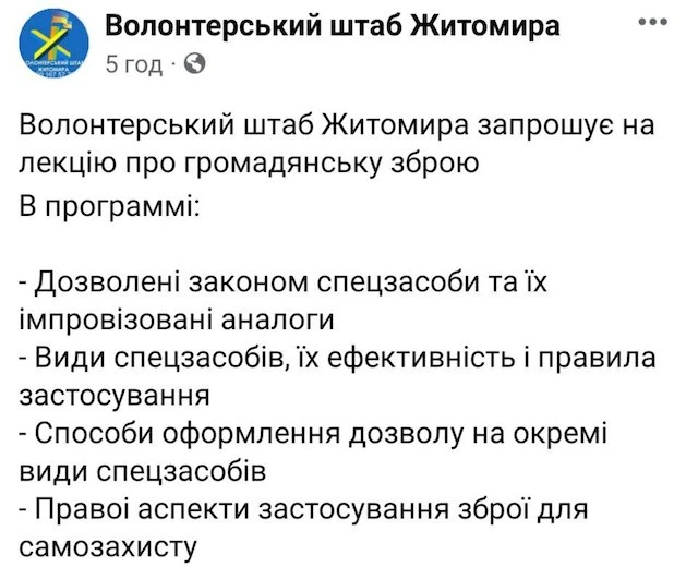 У суботу 30 квітня відбудеться лекція про зброю та спецзасоби для цивільних громадян.
