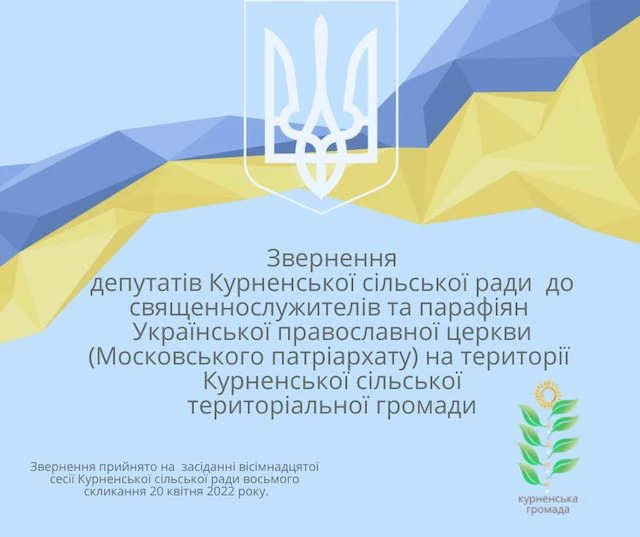 Ми, депутати Курненської сільської ради, представляючи інтереси громади і держави Україна, не бажаємо бачити нічого московського в нашій країні. Жоден зі священнослужителів Української православної церкви (Московського патріархату) на території Курненської сільської територіальної громади за час російського вторгнення в нашу країну не прийняв рішення про відмову від московського патріархату. Парафіян зазначеної церкви закликаємо не підтримувати Московський патріархат. Хочеться вірити, що між вами є свідомі люди, які здатні думати своїм розумом. Знайдіть в собі мужність сказати НІ так, як це зробили багато вірних священників ще у 2018-2019 роках, а також ті які роблять це сьогодні і ми в єдності переможемо ворога.