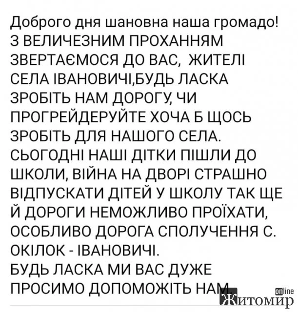Жителі села Івановичі, що в Житомирському районі, просять владу зробити їм дорогу – хоча б прогрейдерувати.