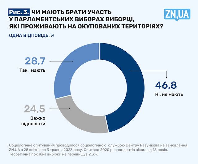 Тепер два важливі виміри. Так, на запитання: «Чи мають брати участь у парламентських виборах виборці, які проживають на окупованих територіях», 46,8% опитаних відповіли позитивно. 24,6% — утруднилися відповісти, а 28,7% — узагалі відмовили їм у такому праві. Виходить, що майже третина опитаних на емоційному рівні відрізали/майже відрізали від України окуповані після 24 лютого території. І людей.