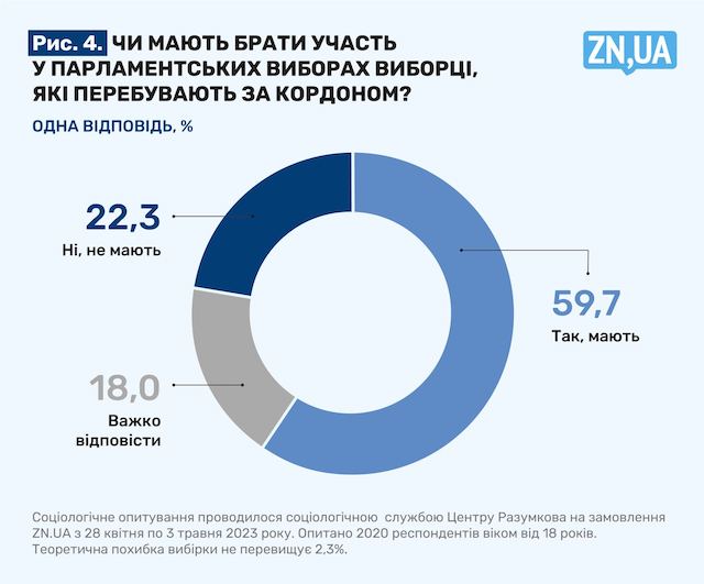 А що з тими, хто виїхав за кордон? Чи мають брати участь у парламентських виборах виборці, які перебувають за кордоном? Переважна більшість опитаних соціологами (59,7%) вважають, що так. А 22,3 % — що ні. Плюс 18% тих, хто не визначився. І це високий показник, тому що ми розуміємо: людям не можна відмовляти в праві не тільки голосувати, а й бути обраними.