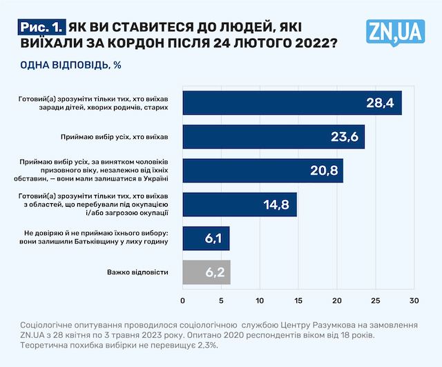 Найбільший відсоток (28,4) — тих, хто розуміє цей вибір, але тільки якщо його зроблено заради дітей, хворих родичів і старих. Друга за величиною кількість — ті, хто приймає вибір людей, які виїхали, — 23,6%. І це для України показова цифра, яка корелюється з тривогою, що у разі тимчасового скасування ВС якась частина чоловіків призовного віку може залишити країну. Хоча водночас 20,8% опитаних приймають вибір усіх, хто виїхав, за винятком чоловіків призовного віку, незалежно від їхніх обставин. На думку респондентів, вони мають залишатися вдома.