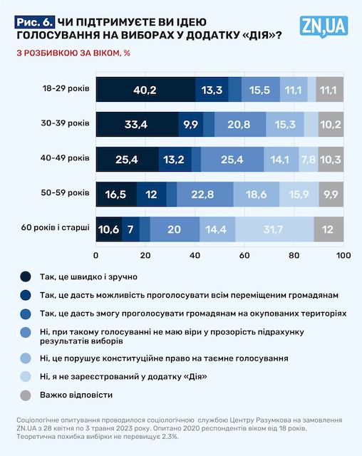 Тема голосування через платформу широко обговорюється лише у вузьких колах. У людей, які, по суті, вперше стикнулися з таким питанням, не було часу задуматися. Тому за всієї любові до сервісу й віддаючи належне голові Мінцифри Федорову та його команді, які зробили багато корисного під час війни, лише 23,7% опитаних із розгону готові голосувати в «Дії». Недивно, що переважна більшість із них (73,6%) — це молодь від 18 до 39 років. 10,5% є прихильниками електронного голосування, тому що так «можуть проголосувати всі переміщені особи». 4,4%, розмірковуючи на цю тему, згадали про права жителів окупованих територій, яким «Дія» також може дати можливість висловити свою думку.