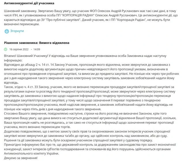 Зауважимо, що 16 серпня один з учасників тендеру ФОП Герасін Віталій Вікторович подав скаргу на антиконкурентні дії учасників, вказавши що ФОП Олексюк Андрій Русланович має такі самі дані, в тому числі ІПН, як і уповноважена особа ПП «Корпорація Радіан» Олексюк Андрій Русланович.