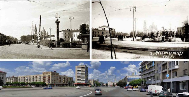 Почнемо з першої зліва у верхньому ряду ілюстрації. Це вицвіла від часу фотографія кінця ХІХ століття. Імовірно 1890-ті роки. Вона з літературно-меморіального музею Михайла Булгакова у Києві. Називалася площа тоді Семінарійської, оскільки в середині ХІХ століття, коли їй дали таку назву, на неї виходила Житомирська римсько-католицька духовна семінарія – колишній Бернардинський монастир. Але на цій фотографії ми семінарію не бачимо. Пересічна забудова (праворуч) двоповерховими будинками вже відокремили семінарію від площі. Справа, де кутовий триповерховий будинок — це початок Київської вулиці. Зліва – початок Вільської вулиці. З 1897 по 1912 роки вона називатиметься Соборною вулицею, потім вулицею 1812 року, за радянської влади Карла Лібкнехта, а нині вулиця Перемоги. На передньому плані ми бачимо єдиний вид міського транспорту — гужовий. Близько двох десятків екіпажів чекають на пасажирів. У Миколи Костриці та Руслана Кондратюка у книзі “Житомир” читаємо: «За переписом 1897 року, у цьому промислі було зайнято 578 осіб. Візники ділилися на дві категорії: пасажирські та вантажні. Останніх називали ломовиками. Основним місцем стоянки та збору візницьких екіпажів була Соборна площа, де діяла так звана біржа, від якої було схоже одне з назв площі — Біржова. Тут екіпажі отримували реєстраційний номер, виданий у міській управі, який закріплювався на зовнішньому боці екіпажу». Тут слід пояснити, що тоді Соборною називалася нинішня площа Перемоги.