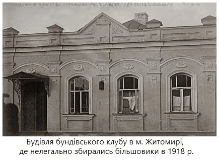Фотографія будівлі бундівського клубу у Житомирі 1918-го року. Підпис на фото інформує, що тут збирались більшовики.