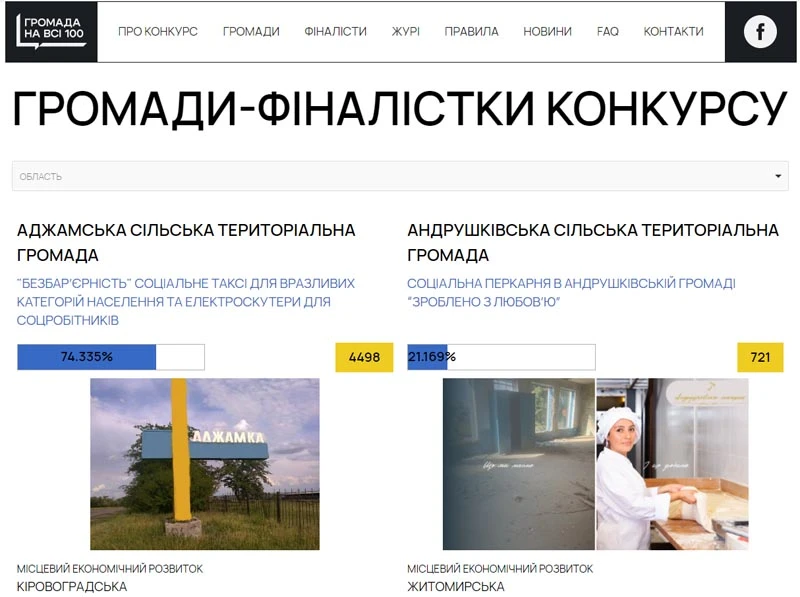 Всього на участь в конкурсі свої проекти подали 261 громада, а нещодавно були підведені підсумки його першого етапу та визначені сорок фіналістів, які проходять в другий тур. Найбільше голосів громади (у відсотках від загальної кількості мешканців) отримав у першому турі проект Байковецької громади Кіровоградщини «Соціальне таксі» – 74,3 % голосів. Друге місце посів проект Андрушківської громади Житомирського району «Соціальна пекарня» – 21% голосів.