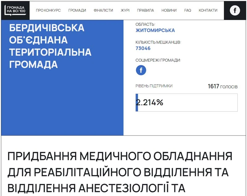 Бердичівська міська громада на цей конкурс подала проект закупівлі обладнання для реабілітаційного відділення.