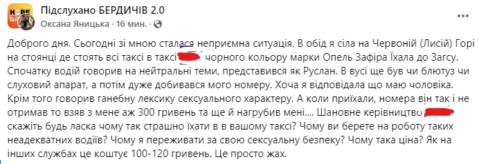 Реклама ПІДПИСАТИСЯ НА TELEGRAMПІДПИСАТИСЯ НА FACEBOOKСвіжі новиниУ Житомирі ветеранам вручили державні та відомчі нагородиНе викидайте яєчну шкаралупу: простий лайфхак для саду та...Комуналка, одяг і продукти дорожчають: Держстат за перший квартал...На Житомирщині рятувальники та лісівники спільно патрулюють ліси, щоб...FacebookTwitterTelegramWhatsAppViberEmailPrintCopy URL ГоловнаПодіїСексуально-агресивні бердичівські таксисти: добивався від пасажирки номера, а коли не отримав, то...Сексуально-агресивні бердичівські таксисти: добивався від пасажирки номера, а коли не отримав, то взяв аж 300 гривень та ще й нагрубив7 Грудня, 2024р 21:50 Бердичівляни скаржаться на таксистів міста: Реклама Що пишуть житомиряни в інтернеті: Реклама Поширити у Facebook Попередня стаття“Історичний день”: Макрон прокоментував зустріч із Трампом та ЗеленськимНаступна стаття“Заживо згоріли в машинах”: зʼявились страшні подробиці удару РФ по ЗапоріжжюЧитайте також ІнформаціяУ Житомирі ветеранам вручили державні та відомчі нагороди 19 Квітня, 2026р 17:04 ІнформаціяНе викидайте яєчну шкаралупу: простий лайфхак для саду та городу 19 Квітня, 2026р 16:41 ІнформаціяКомуналка, одяг і продукти дорожчають: Держстат за перший квартал 2026 року 19 Квітня, 2026р 16:21 ІнформаціяНа Житомирщині рятувальники та лісівники спільно патрулюють ліси, щоб запобігти пожежам 19 Квітня, 2026р 16:09 ІнформаціяУ Хорошеві рятувальники зібрали ртуть після розбитого термометра 19 Квітня, 2026р 15:24 Інформація19 квітня: Провідна неділя, народні прикмети та погода у Житомирі 19 Квітня, 2026р 15:17 Автор: Катерина Смішко Реклама