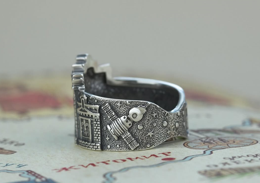 «Що ще можна дізнатися про Житомир з каблучки? Зліва поспішає ретро-трамвай: ще у 1899 році місто отримало електричний транспорт, зручний й екологічний. Сьогодні його використовують для тематичних прогулянок й згадки про цікаву історію. Справа ж летить космічний корабель, розроблений під керівництвом Корольова, геніального вченого, що народився саме в Житомирі. Ці кораблі здійснили більш ніж 130 успішних польотів й до 2020 року були єдиною можливістю доставляти екіпажі на Міжнародну космічну станцію – маємо чим пишатися», – йдеться в описі каблучки.