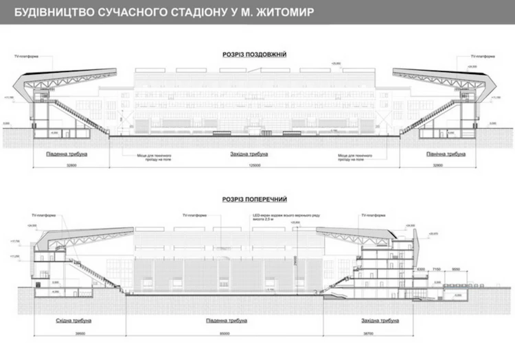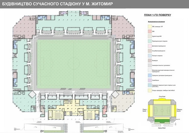 - Спортивний блок: трибуни, VIP-зони, приміщення для ЗМІ, укриття.