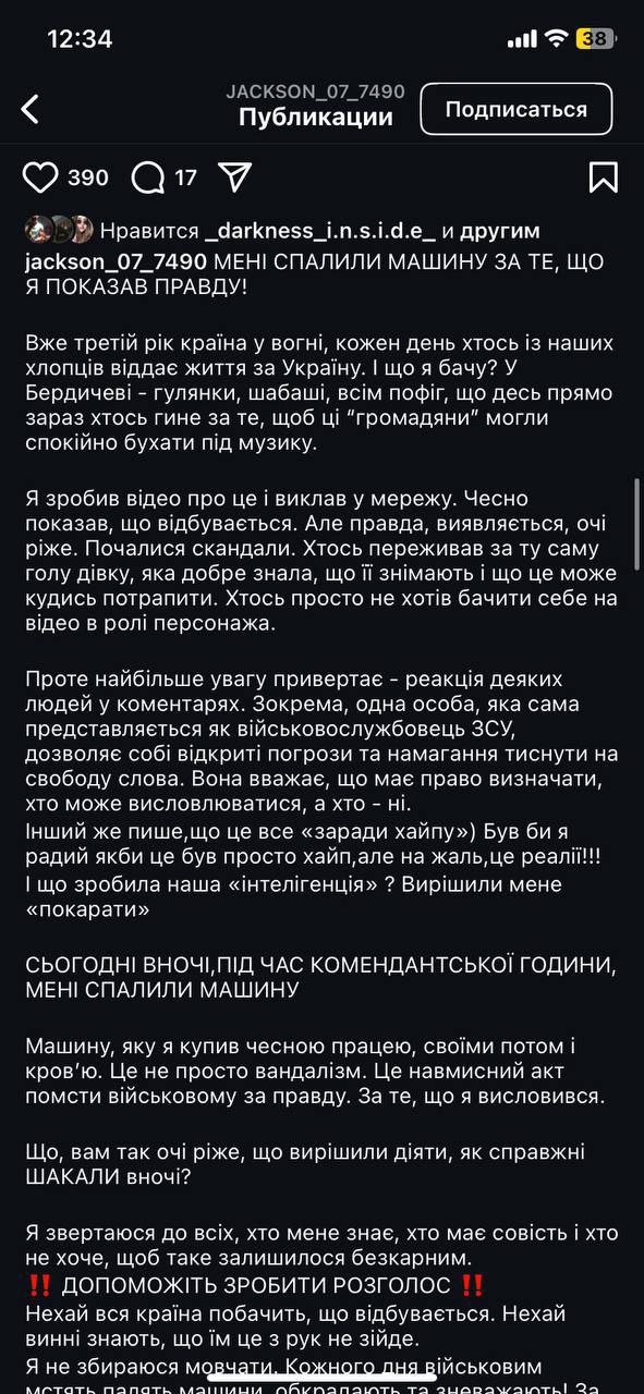 “Мені спалили машину за те, що я показав правду” – повідомив у соцмережах власник автомобіля з Бердичева.