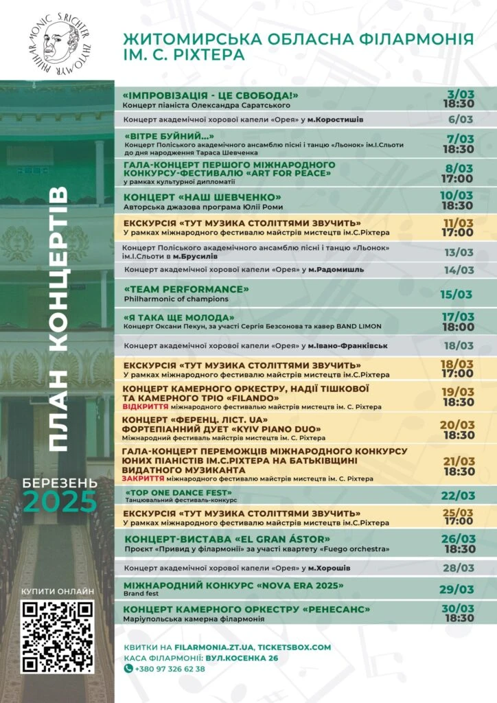 Житомирська обласна філармонія імені Святослава Ріхтера запрошує поціновувачів музики на концертні дійства, які відбудуться у березні.