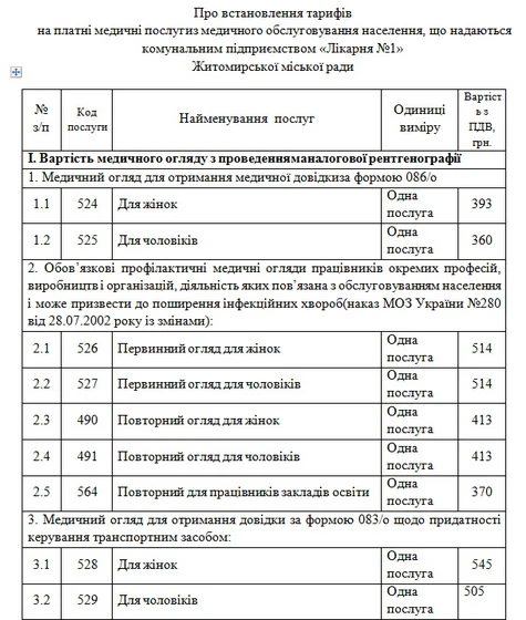 Виконавчий комітет Житомирської міської ради 19 березня 2025 року ухвалив рішення про затвердження тарифів на платні медичні послуги, які надає КП «Лікарня №1» і які не фінансуються Національною службою здоров’я України за Програмою медичних гарантій.