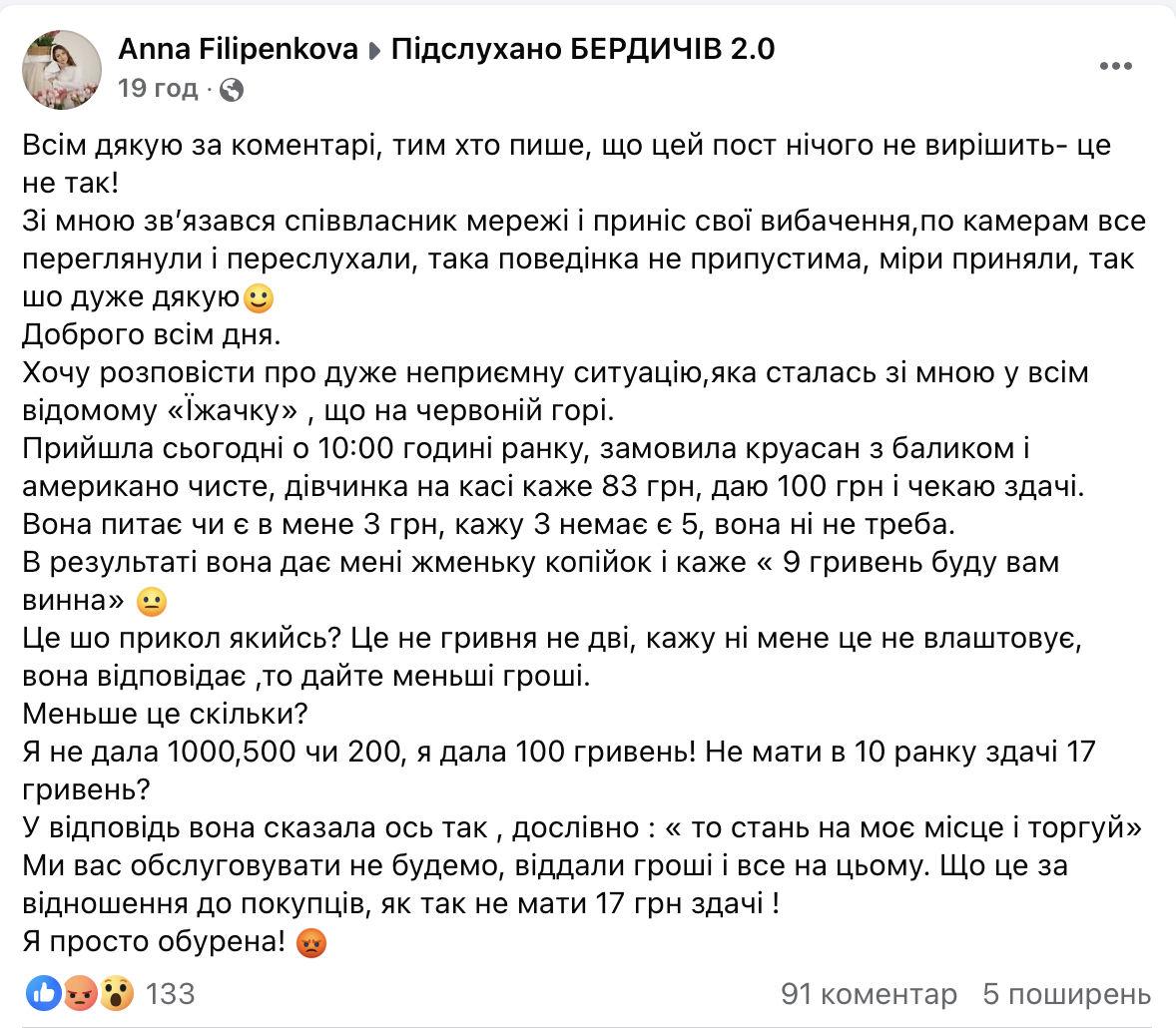 Хочу розповісти про дуже неприємну ситуацію,яка сталась зі мною у всім відомому «Їжачку» , що на червоній горі. Прийшла сьогодні о 10:00 годині ранку, замовила круасан з баликом і американо чисте, дівчинка на касі каже 83 грн, даю 100 грн і чекаю здачі. Вона питає чи є в мене 3 грн, кажу 3 немає є 5, вона ні не треба. В результаті вона дає мені жменьку копійок і каже « 9 гривень буду вам винна» 😐 Це шо прикол якийсь? Це не гривня не дві, кажу ні мене це не влаштовує, вона відповідає ,то дайте меньші гроші. Меньше це скільки? Я не дала 1000,500 чи 200, я дала 100 гривень! Не мати в 10 ранку здачі 17 гривень? У відповідь вона сказала ось так , дослівно : « то стань на моє місце і торгуй» Ми вас обслуговувати не будемо, віддали гроші і все на цьому. Що це за відношення до покупців, як так не мати 17 грн здачі ! Я просто обурена!”, написала про цю подію у соцмережі Фейсбук Анна Філіпенкова.