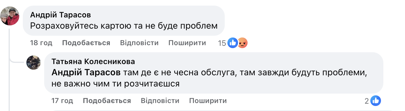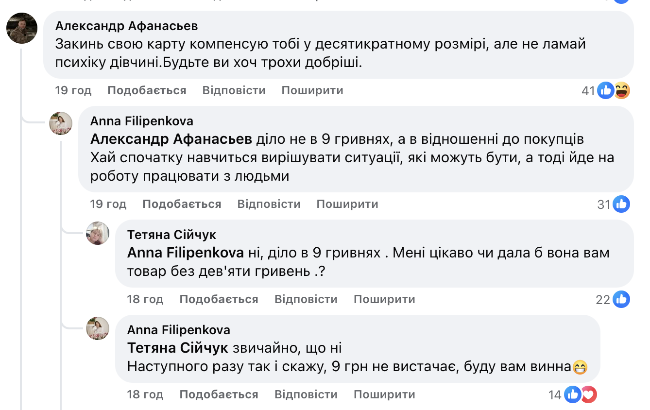 “Всім дякую за коментарі, тим хто пише, що цей пост нічого не вирішить- це не так! Зі мною звʼязався співвласник мережі і приніс свої вибачення,по камерам все переглянули і переслухали, така поведінка не припустима, міри приняли, так шо дуже дякую🙂 Доброго всім дня.