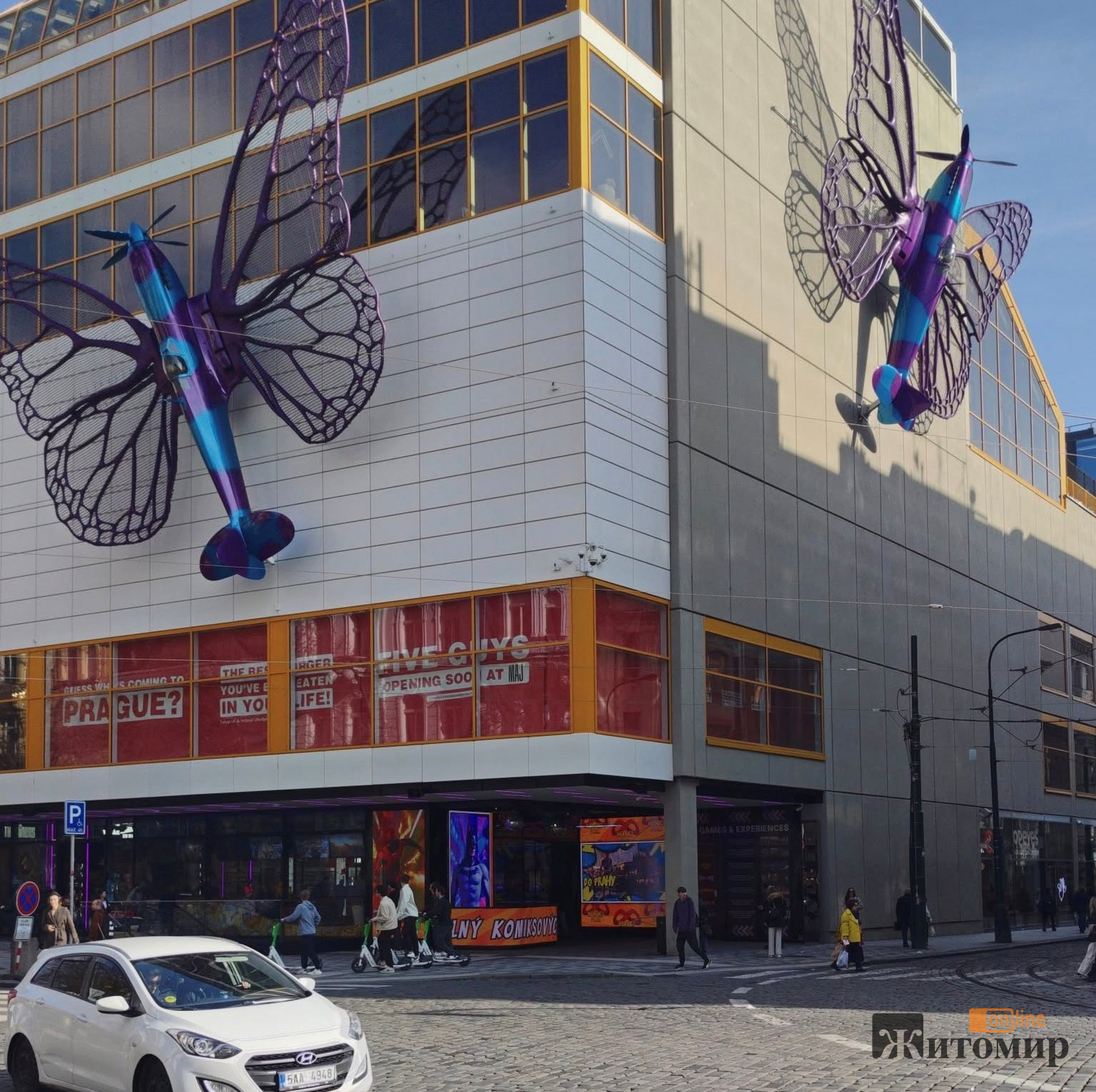 Це фото зроблено у Празі, Чехія. Воно показує сучасну будівлю з великою мистецькою інсталяцією у вигляді літаків із крилами метеликів. Така композиція створює враження легкості та польоту.