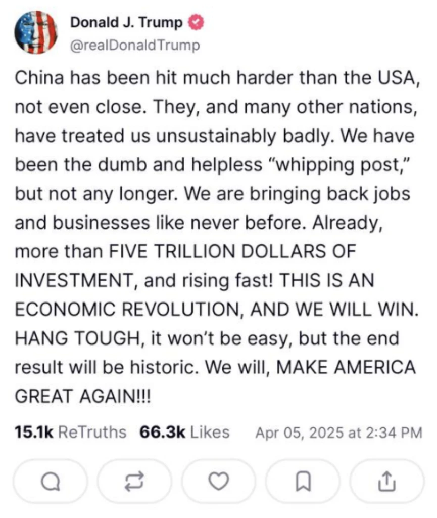 Президент США Дональд Трамп у своєму дописі в соціальній мережі Truth Social заявив, що Сполучені Штати перебувають на порозі “економічної революції”, яка, за його словами, буде складною, але завершиться “історичним результатом”.