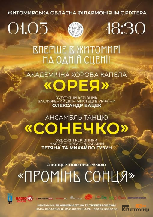Запрошуємо 1 травня о 18:30 до Житомирської обласної філармонії ім. С. Ріхтера на особливий вечір, де музика й танець переплітаються в єдиному ритмі, створюючи яскраву мозаїку емоцій та краси – «Промінь Сонця»!