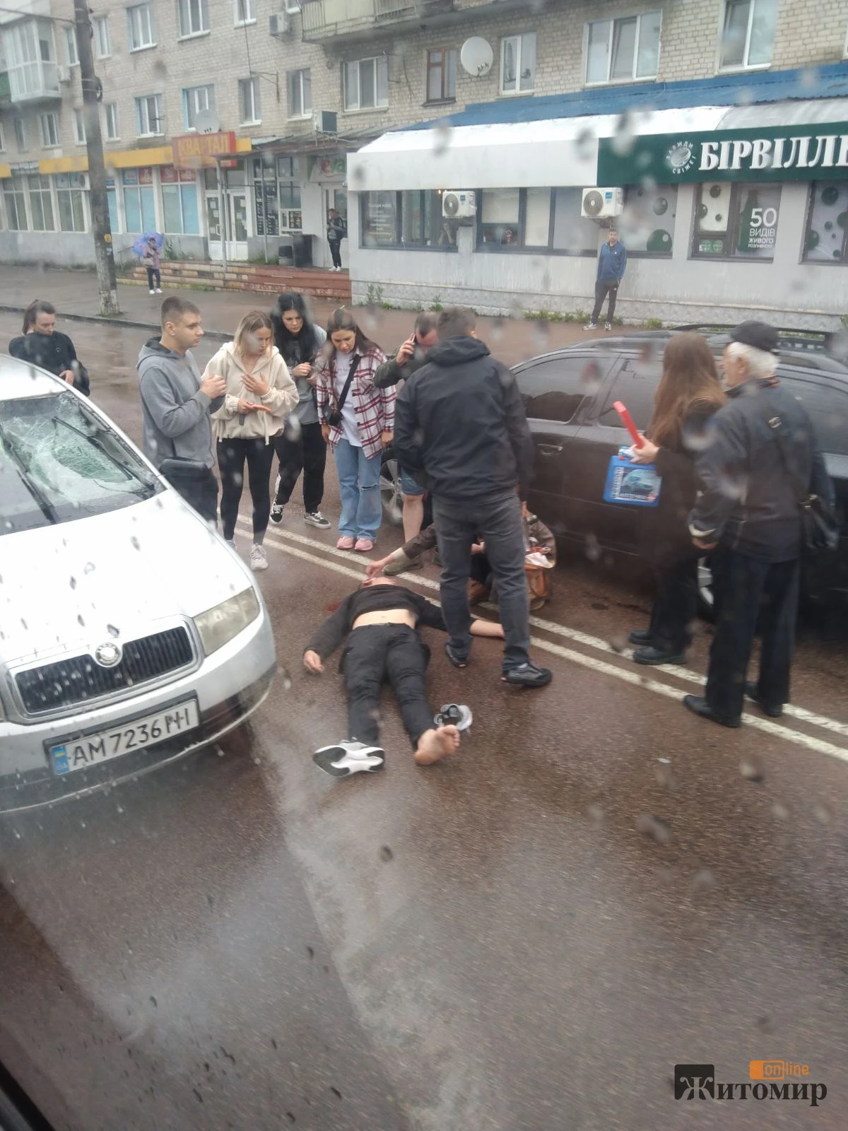 Фото надіслав читач, який об’їжджав ДТП. Він і розповів, що у чоловіка розбита голова та з однієї ноги від удару злетів кросівок, але, на щастя, чоловік живий.