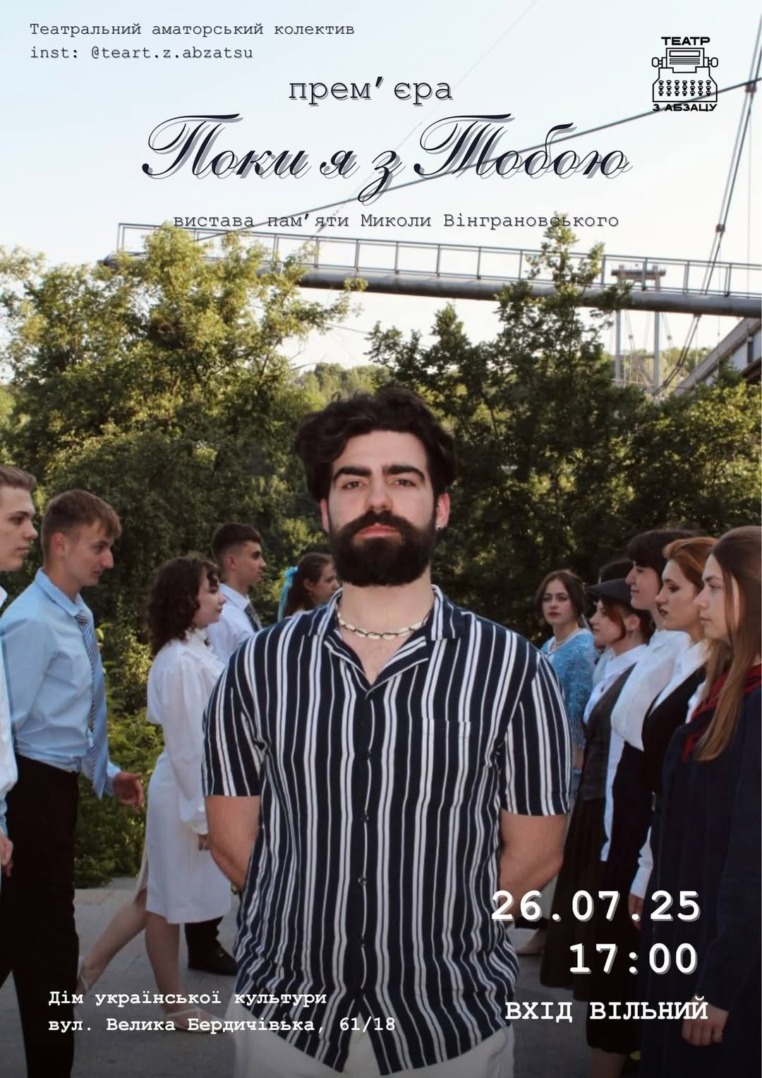 26 липня о 17:00 в Домі української культури в Житомирі відбудеться прем’єра вистави «Поки я з тобою», яку готує Театр з Абзацу. Ця подія — не просто театральний перформанс, а щемка посвята людині-епосі — Миколі Вінграновському: поету, прозаїку, кінорежисеру, актору, чий голос «пахне вечірніми акаціями та незнятими фільмами».