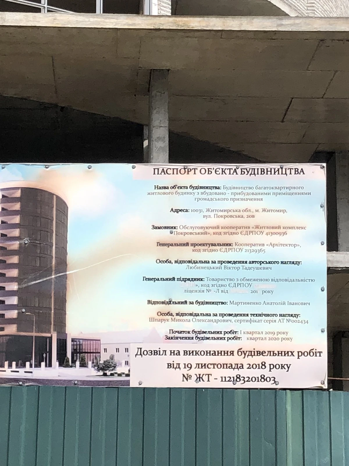 Розпочати будівельні роботи планували в першому кварталі 2019 року, а завершити будівництво повинні були через рік. Але не так сталося, як гадалося. Нині тут ніби все завмерло. Якщо звернути увагу на паспорт об’єкта будівництва, то його замовником є обслуговуючий кооператив «Житловий комплекс «Покровський», а там де рядок «Генеральний підрядник» можна прочитати лише слово «Товариство…», бо далі всі назви затерті.