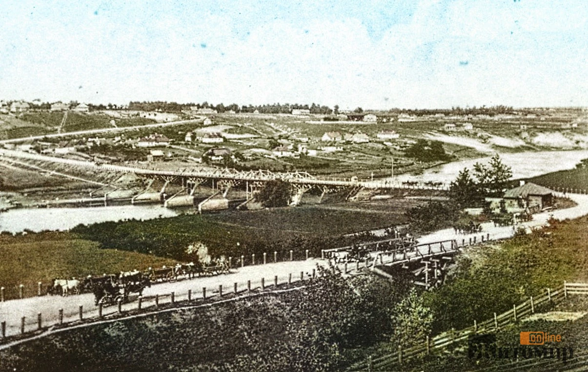 На знімку можна побачити дерев’яний міст через річку, невеликі сільські будинки на пагорбі та вози з кіньми — типовий гужовий транспорт того часу. Цей кадр відображає атмосферу періоду до масової урбанізації, коли околиці Житомира ще залишалися переважно сільськими, а дороги були ґрунтові.