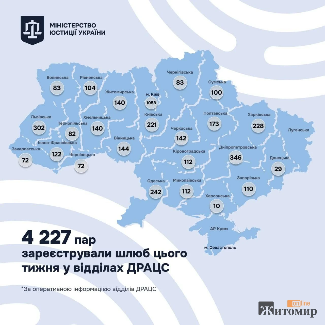 Загалом по Україні за цей період зареєстрували понад 4 тисячі шлюбів, найбільше — у Києві, де одружилися 1058 пар.