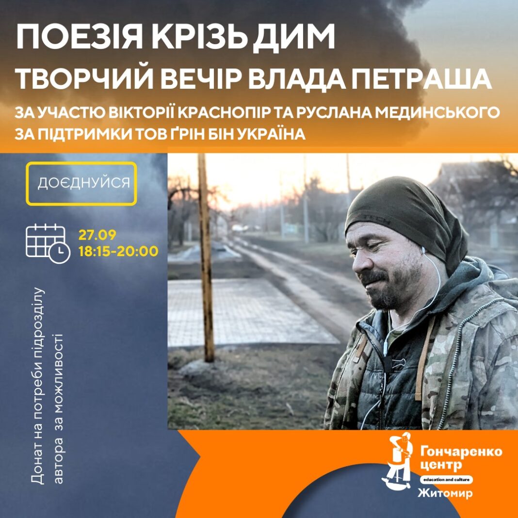 27 вересня 2025 року Житомирський Гончаренко Центр проведе творчий вечір «Поезія крізь дим» за участю поета Влада Петраша, а також Вікторії Краснопір і Руслана Мединського.