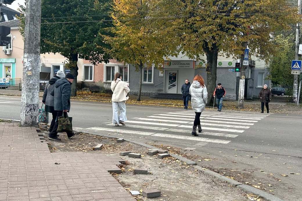 У Житомирі на перехресті вулиць Перемоги та Ольжича тротуар перебуває у розтрощеному стані: плитка пошкоджена, утворилися ями та калюжі. Пішоходи, серед яких незрячі люди та батьки з дитячими візочками, скаржаться на небезпеку переходу, особливо під час дощу.
