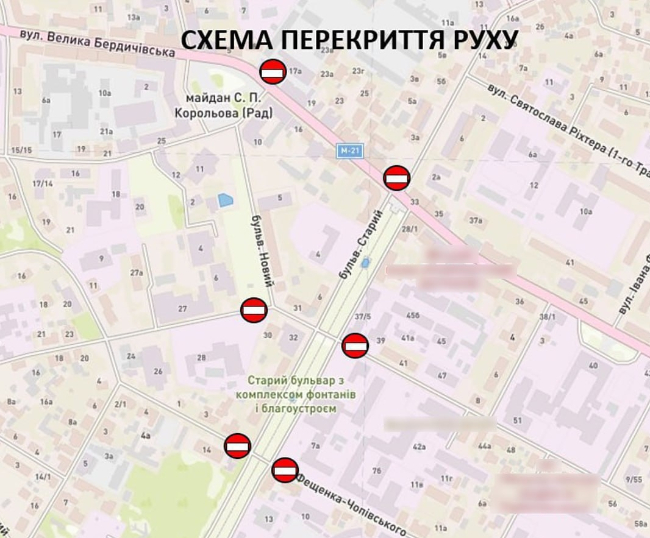 в’їзд на вулицю Мала Бердичівська з вулиці Великої Бердичівської буде перекрито з 5-ї години ранку;