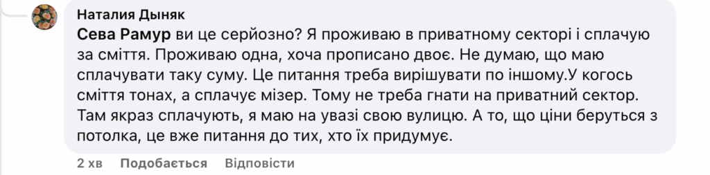 Житомирянка нагадує, що у багатьох ОСББ в Україні мешканці самі укладають договори з перевізниками, обираючи контейнери відповідного об’єму. Вона вважає, що така модель — справедливіша й відповідає реальним витратам.
