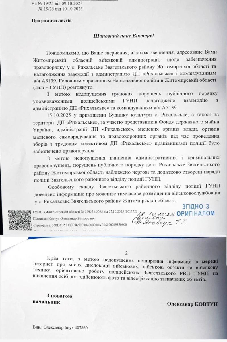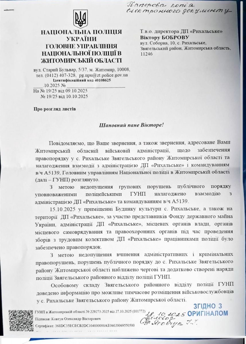 Як повідомляє видання «From-ua», у селі Рихальське Звягельського району Житомирської області в ніч на 8 листопада 2025 року стався збройний напад на державне підприємство «Рихальське».