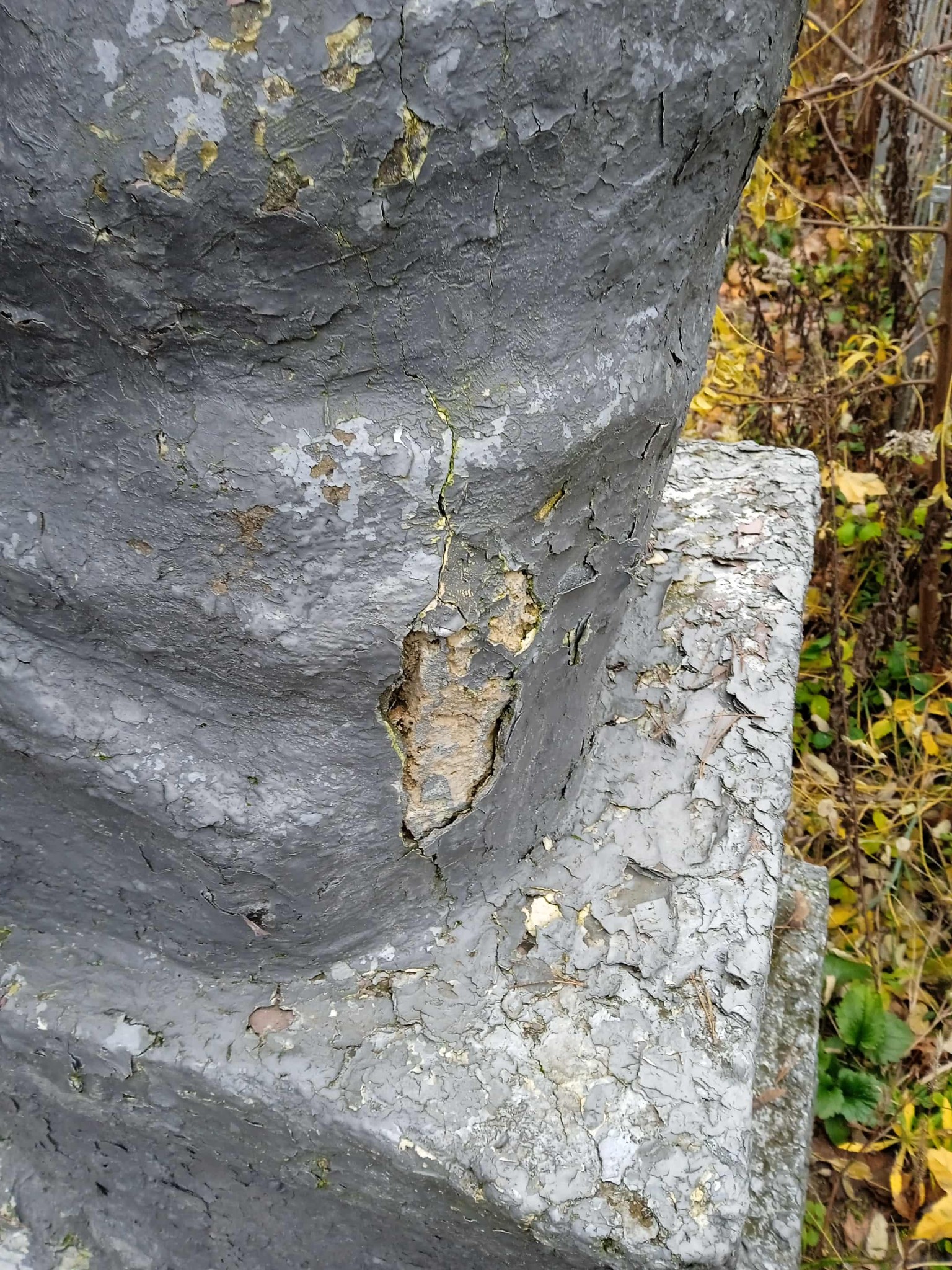За словами голови ГО Богдана Ващенка, бетонна частина пам’ятника сильно потріскалася: на поверхні видно глибокі тріщини, місцями бетон кришиться й обсипається, окремі фрагменти вже втратили цілісність. Краєзнавці наголошують, що конструкція стрімко занепадає і без втручання може зазнати подальших руйнувань.