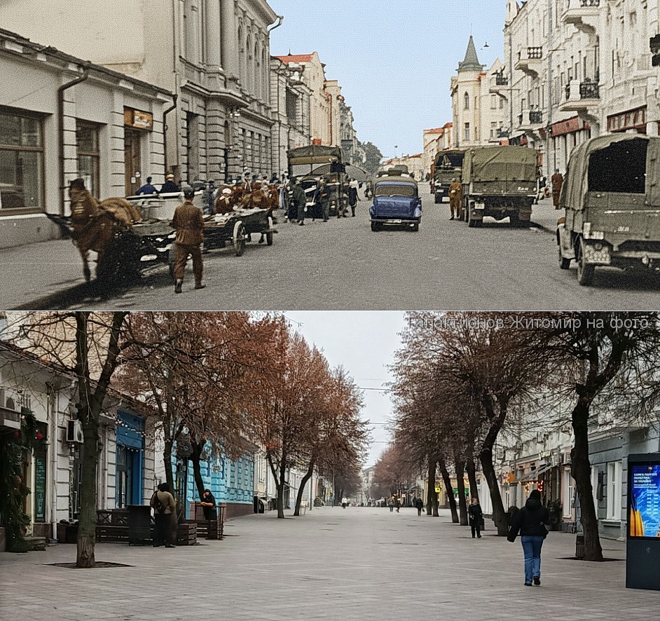 У спільноті «Житомир на фото» адміністратор Константин Галактіонов опублікував унікальне поєднання двох світлин Житомира — з 1941 року та 2025-го. Обидва кадри зроблені на одній і тій самій локації — на ділянці вулиці, що веде в напрямку Коростеня.