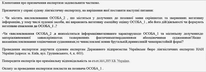 Клопотання про призначення експертизи було подане ще у жовтні. Представник позивача наполягав на її необхідності, тоді як сторона відповідача заперечувала. У результаті суд частково задовольнив клопотання, виключивши одне з поставлених питань щодо визначення об’єктивного змісту висловлювань.