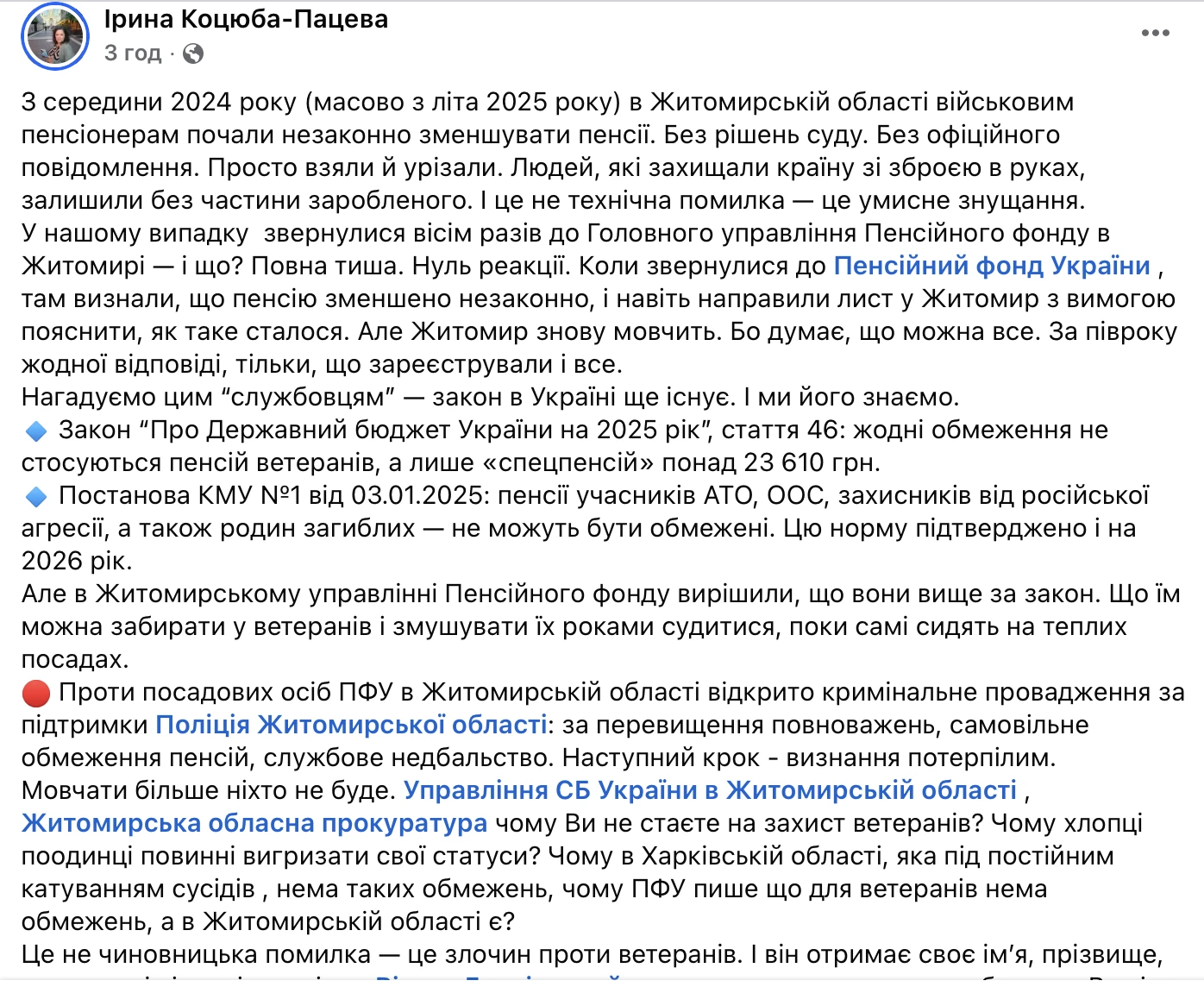 За її словами, йдеться не про технічний збій, а про системні та умисні дії посадовців Головного управління Пенсійного фонду України в Житомирській області. Людям, які захищали державу зі зброєю в руках, фактично урізали вже зароблені виплати.