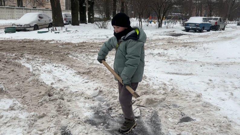 Дев’ятирічний Дамір Тимощук із Бердичева втретє за тиждень вийшов прибрати сніг на подвір’ї біля будинку, пише Суспільне.