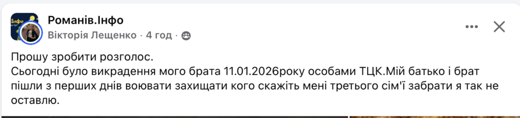 За словами жінки, її брата нібито силоміць вивезли представники територіального центру комплектування. Вона зазначає, що її батько та брат з перших днів повномасштабної війни стали на захист України, і стверджує, що родина не розуміє причин, з яких третього члена сім’ї могли забрати за таких обставин.