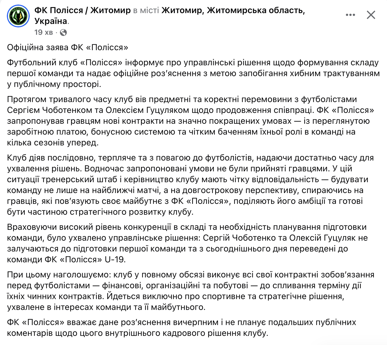 З урахуванням конкуренції в складі та необхідності планування підготовки команди було ухвалено рішення: Сергій Чоботенко та Олексій Гуцуляк не залучаються до роботи першої команди і переведені до складу «Полісся» U-19.
